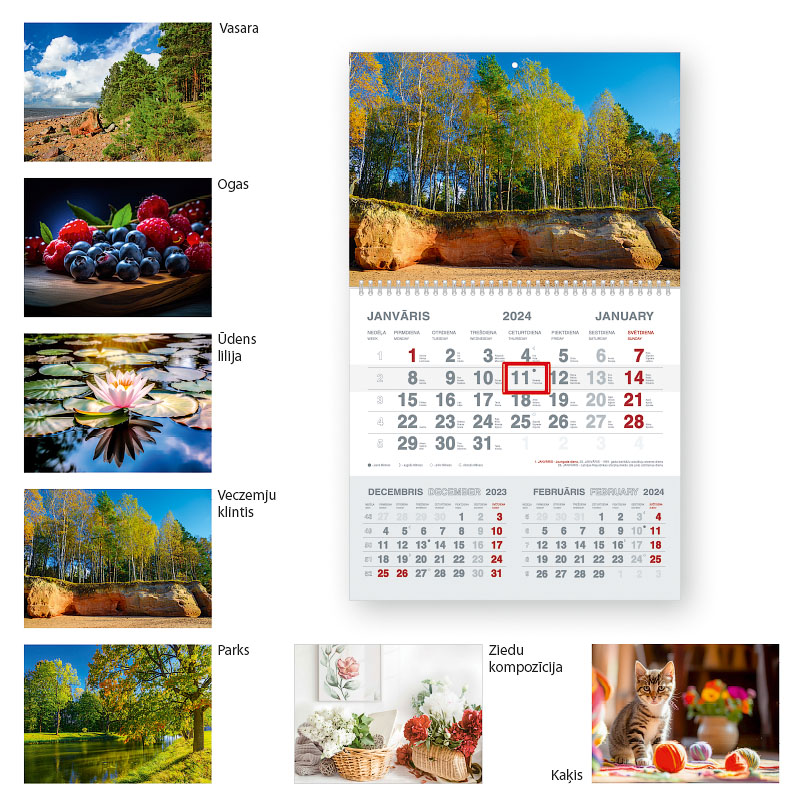 ar krāsainu augšdaļu, vienu spirāli, ar kartona pamatni zem mēnešu lapu bloka, ar lodziņu datuma apzīmēšanai.