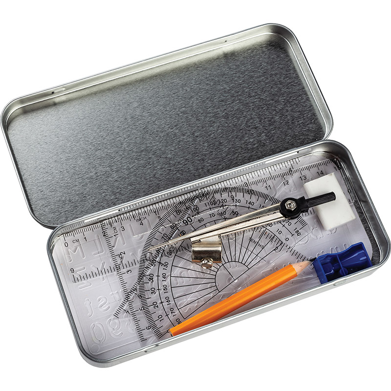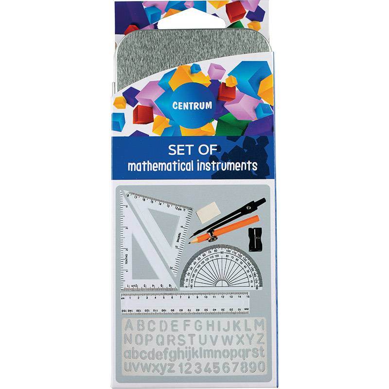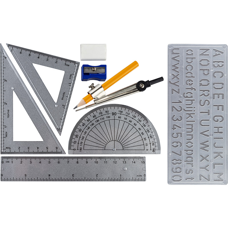 Rasēšanas komplekts (cirkulis, zīmulis, dzēšgumija, zīmuļu asināmais, transportieris, trīsstūris, lineāls) tikai 0.97 EUR | Rasēšanas piederumi - Centrum.lv